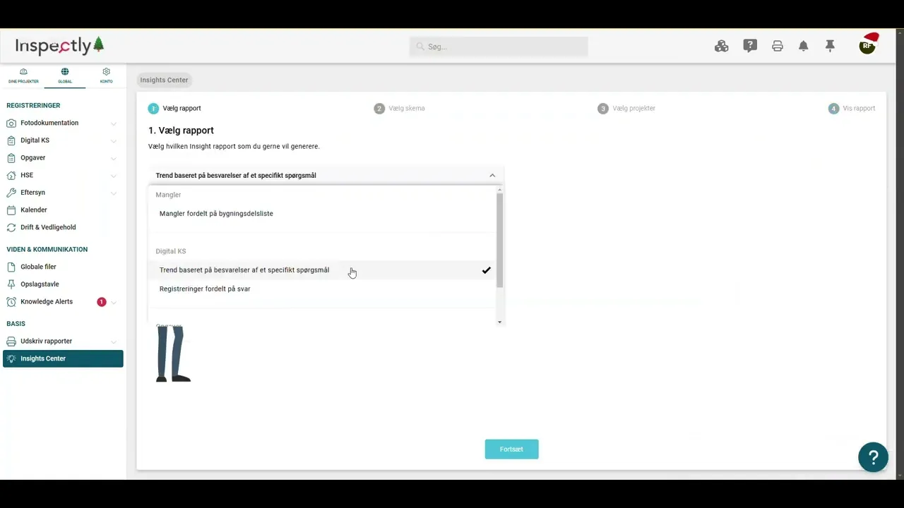 Vælg den rapporttype du gerne vil have en indsigtsrapport over – enten over mangler, om digital ks eller fra opgaver.